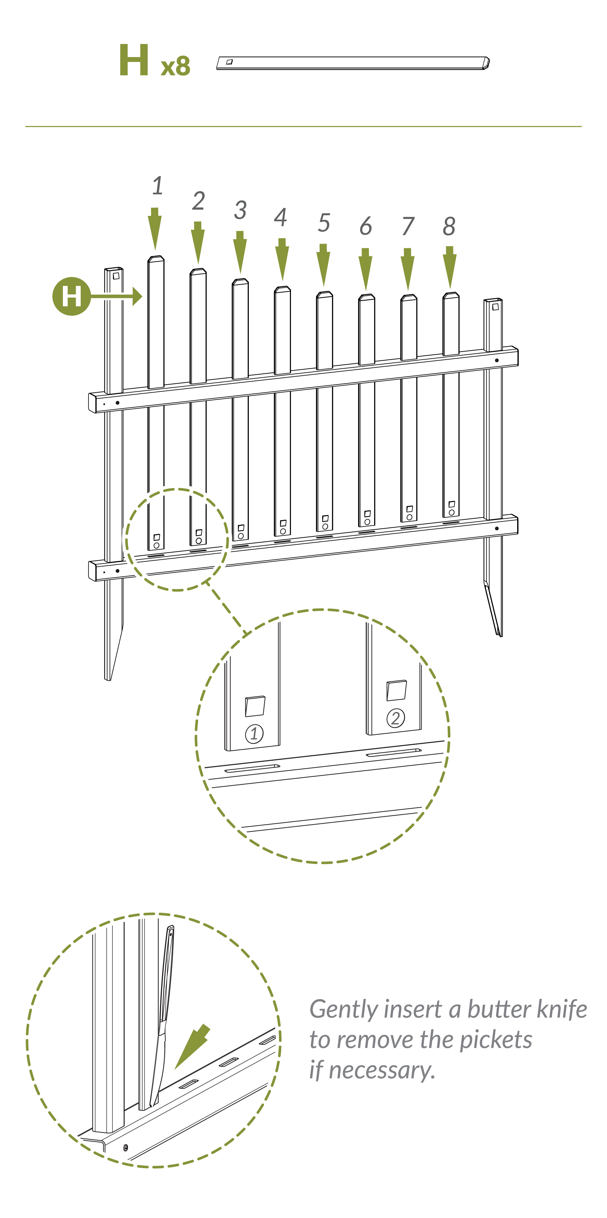 ¼" x 1½" x assorted lengths (scalloped, numbered 1–8)